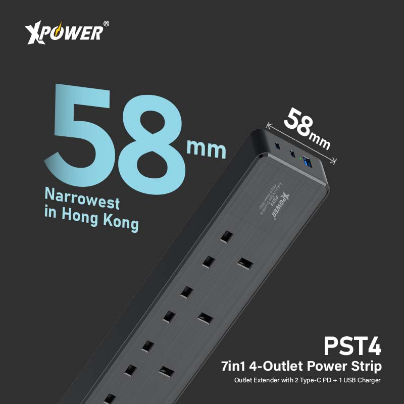 PST4全港最窄身58mm 3米線長 7輸出PD 3.0獨立開關4頭拖板