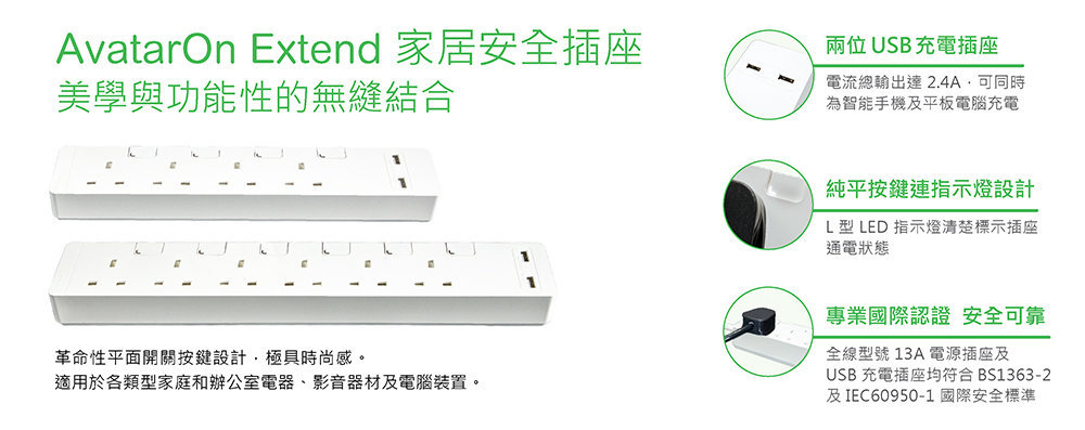 - 符合 BS1363-2 / IEC60950-1 國際安全標準