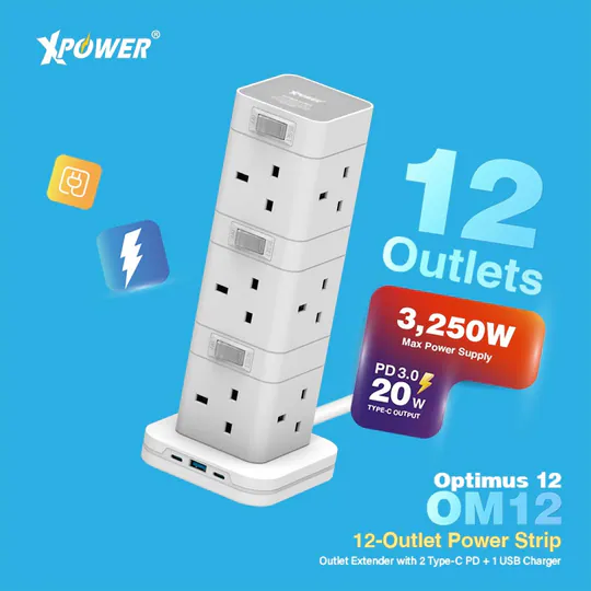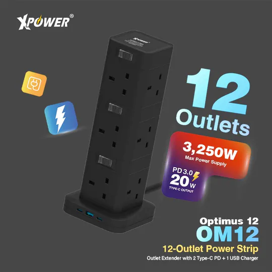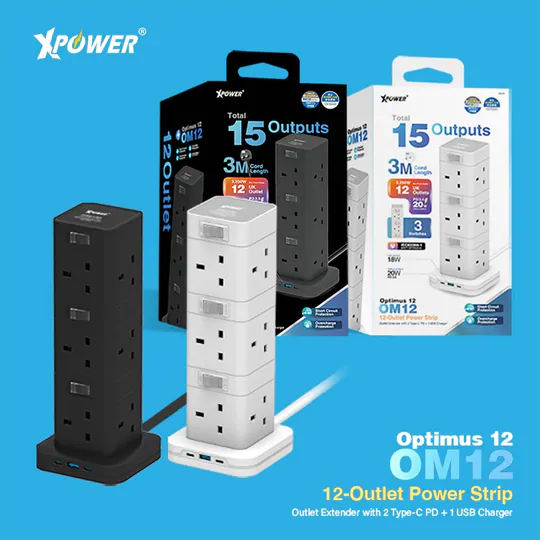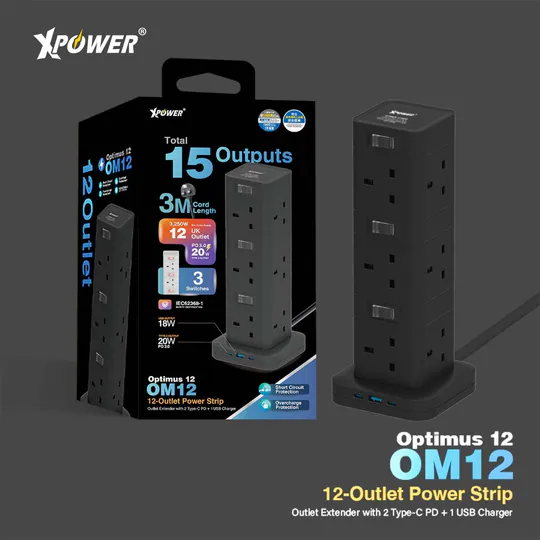 (早買限定優惠)XPower Optimus12 OM12 全港首款直立式15輸出開關拖板(3米線長 12個插頭 PD 3.0輸出)